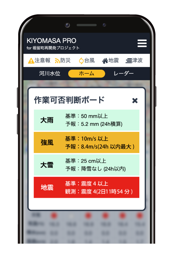 基準を超える予測が出ている場合には「赤」で、基準値の80%以上の予測が発表されている場合は「黄色」で警告。当日もしくは明日の作業で作業中止の判断が必要がどうか、瞬時に判断することができます。表示している気象要素は、大雨・強風・大雪・地震の4種類。