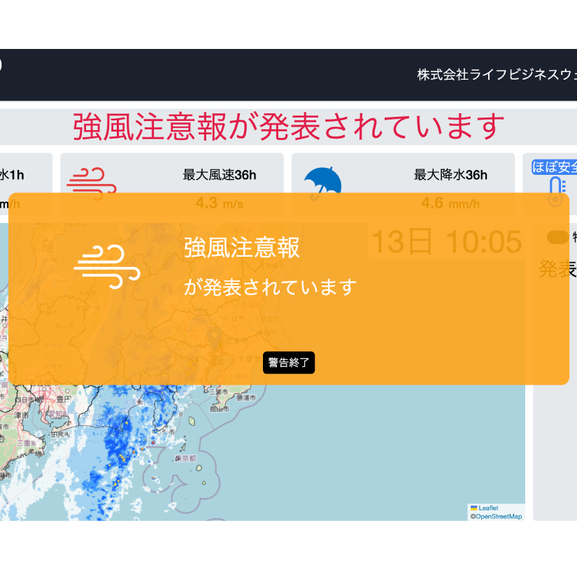 現場の中止基準や任意の設定値を超える予想が発表された場合に、ポップアップと音声で通知します。現場の事務所内や作業場所に設置した、タブレットやサイネージ等で表示することで、瞬時に天気の急変・荒天の知らせを受け取ることができます。