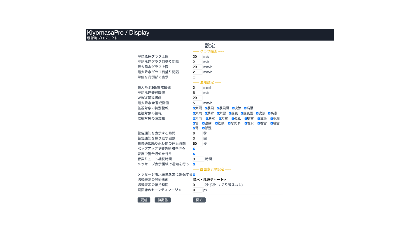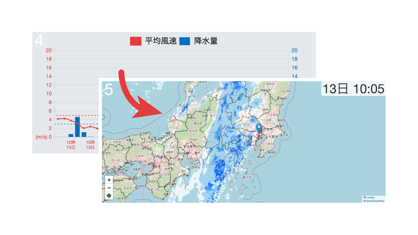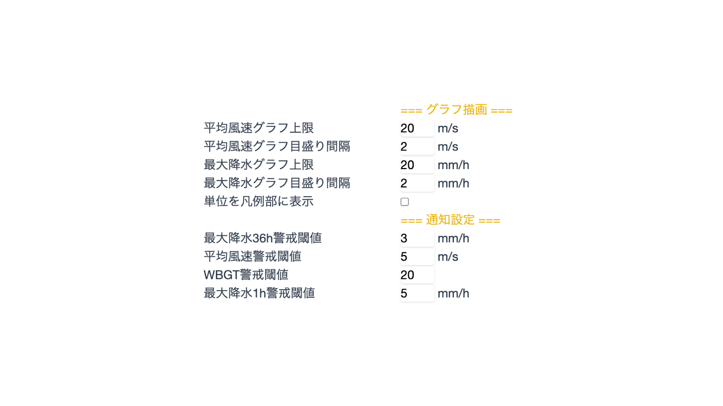 雨雲からグラフへの表示切替時間やグラフの目盛間隔、通知時間のインターバルなど、現場ごとに調整できます。何度でも変更できるため、運用しながら効果的に注意喚起できるよう、現場に合った見え方を探してみて下さい。