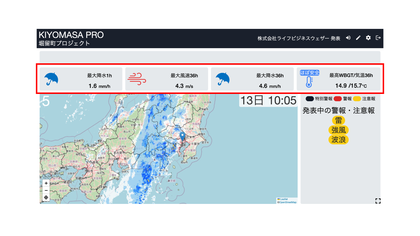 60分先までの降水量や、 36時間先までの降水量/風速/ WBGT値については、最大値(最高値)を簡易的に表示させることで、現場の作業可否判断・安全管理に役立てます。