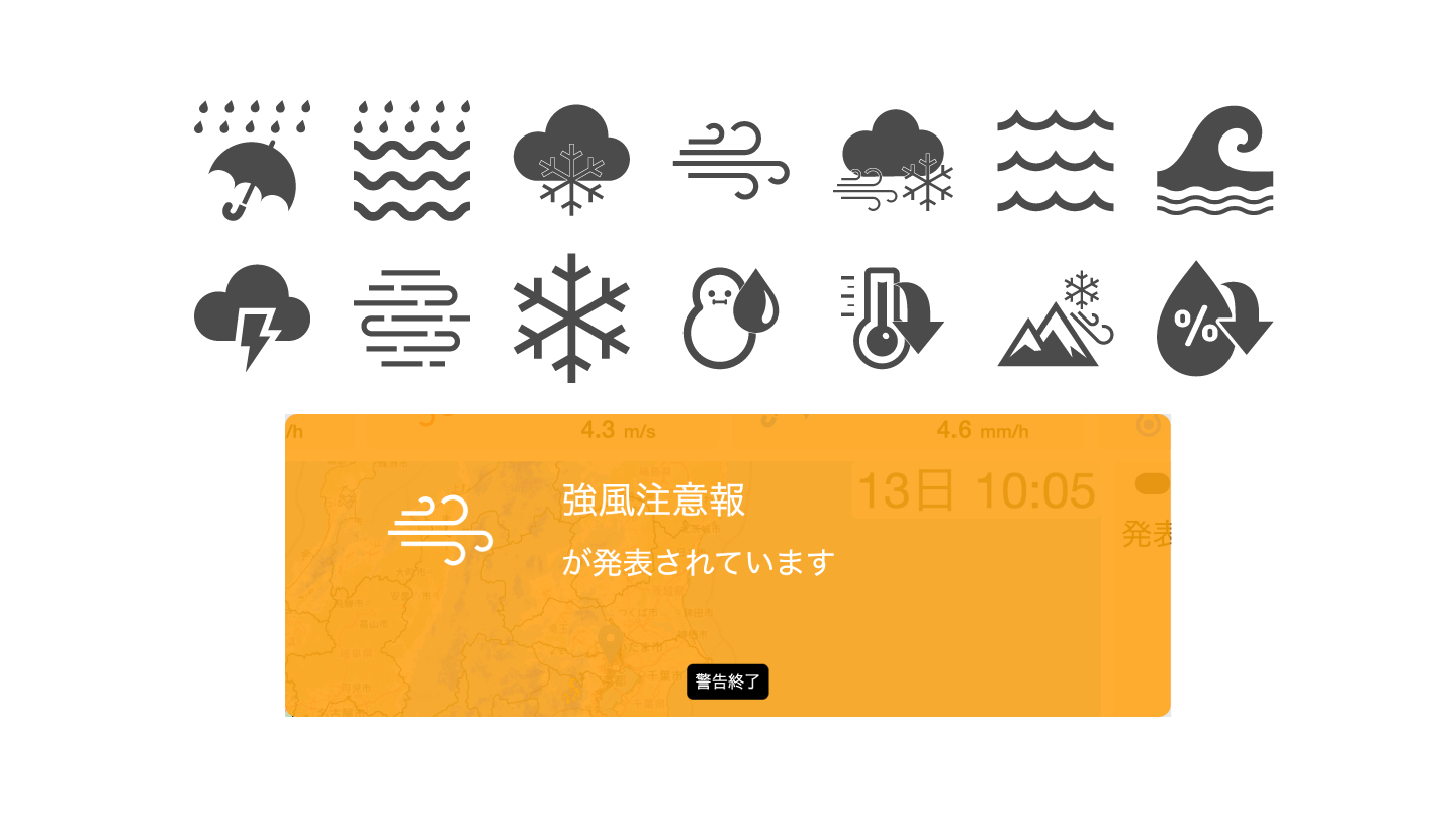 気象要素ごとに、十数種類のアイコンで通知をお知らせします。視覚的にも分かりやすく、現場の対応フローや工事の進捗に合わせて、最適な注意喚起を促すことができます。