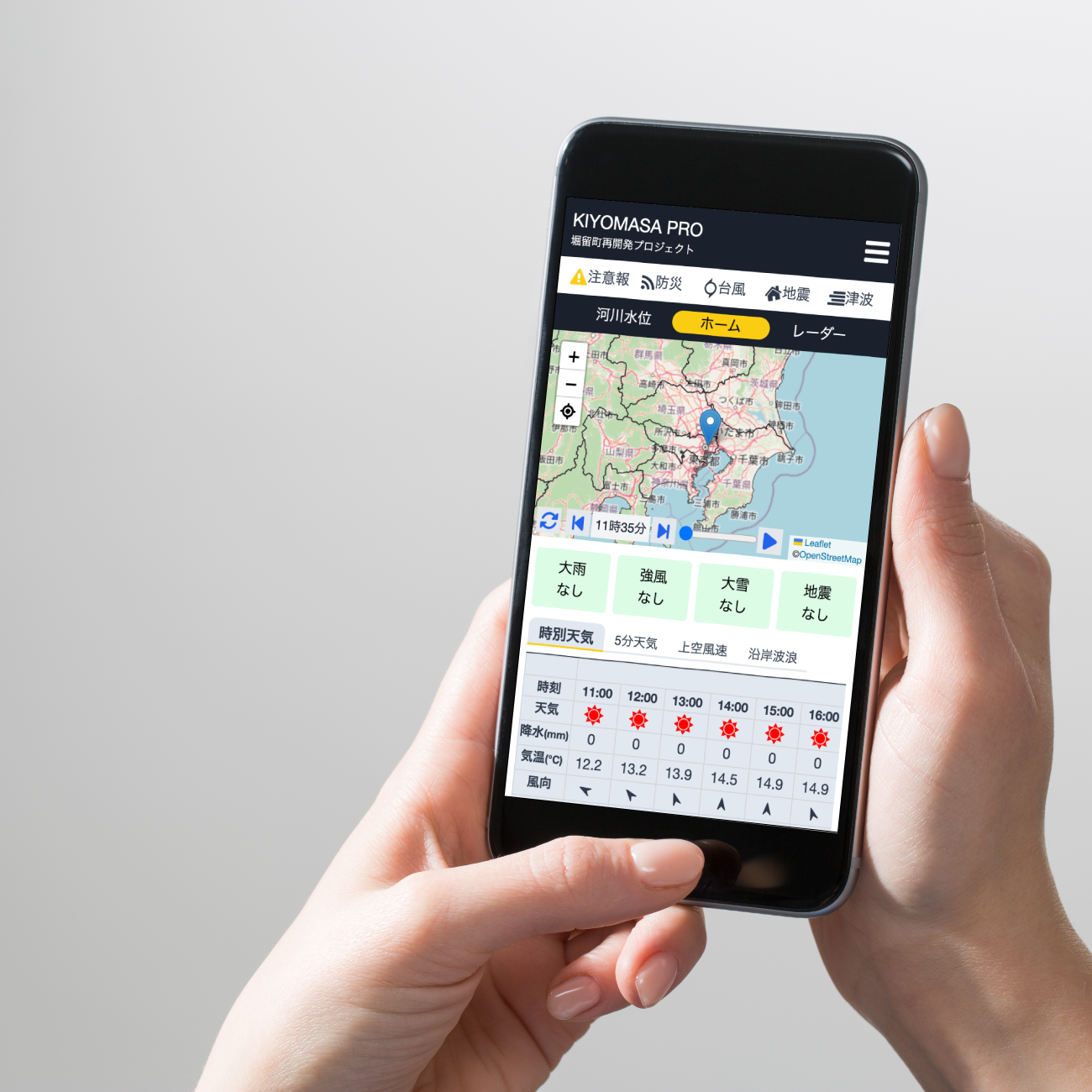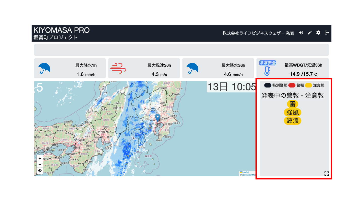 現場の所属する市区町村にどのような特別警報・警報・注意報が発表されているか画面を見ただけで確認できます。