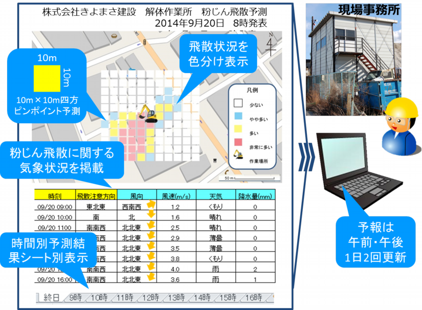 粉じん飛散予測システム「TOBASAN」は、気象リスク管理モバイルKIYOMASA PROで使用している1kmメッシュの高精度気象データを用いて、掘削や解体などにより発生した粉じんの飛散量や飛散方向を10mメッシュごとに予測し、現場の効果的な粉じん対策を支援するシステムです。